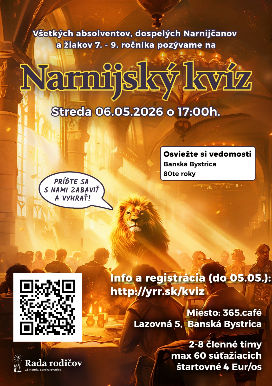 Rada rodičov si pre dospelých Narnijčanov, absolventov a žiakov 7. – 9. ročníka ZŠ Narnia pripravila ďalší kvízový večer, kde aj vy môžete ukázať, čo všetko viete a dať si dobrú kávu! Tentokrát sa pozrieme na tému Banská Bystrica v 80. rokoch. Registrovať sa môžete do večera 05.05.2026.